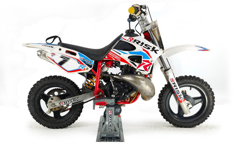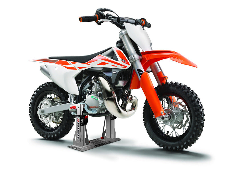 RISK RACING Lock-N-Load Pro systems are fully adjustable in both width and height. This allow to capture a much broader range of bikes, from 85cc to big bore up to 140kg. Users simply set the appropriate width and then roll the bike into the system and press down on the ratcheting jaws until the bike is secure. This new system knows few limits and can haul numerous bikes from a Cobra 50cc to a KTM 690 Enduro!