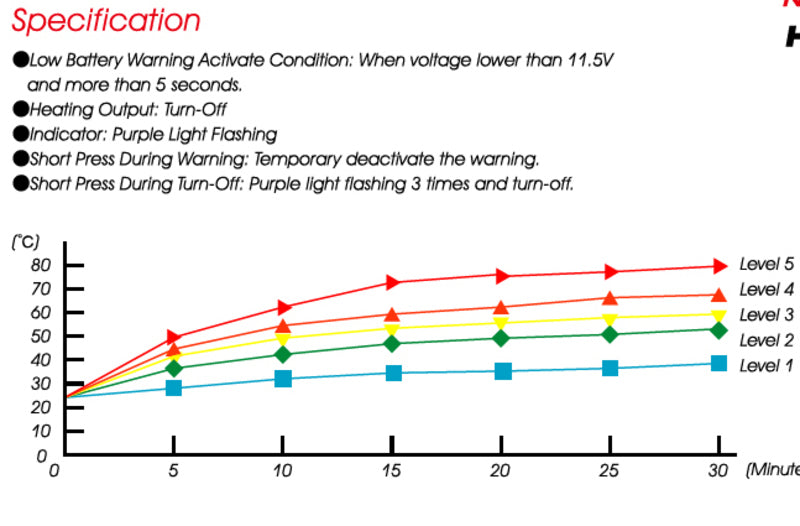 - 5 color LED Indicators for the rider to quickly know in which heat level the grips are set.