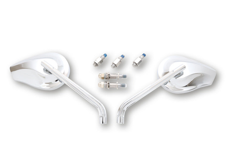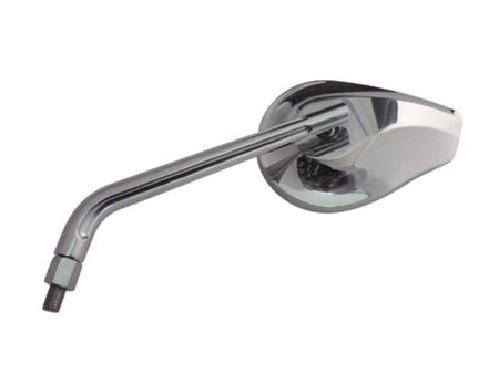 -Chrome-plated aluminum mirror with an oval cut head and bent arm. Includes extra adapter for Harley Davidson and for Yamaha, E-approved.