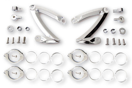 The chrome-plated CNC-milled aluminium lamp holder set contains 4 clamps, 2 holders with screws, washers and reducing strips.