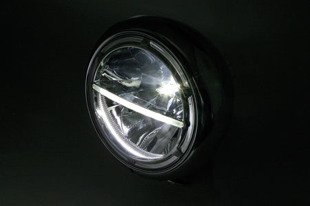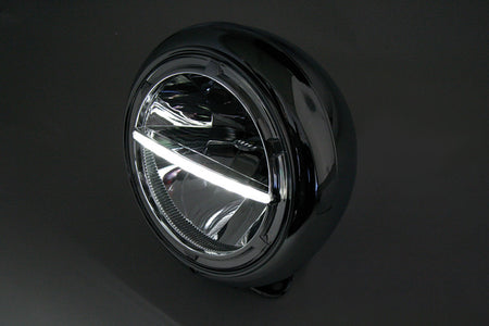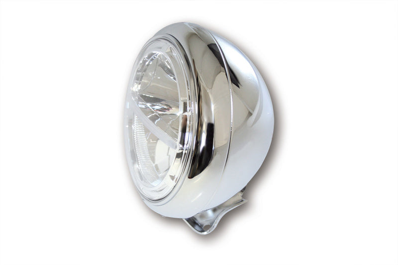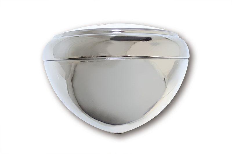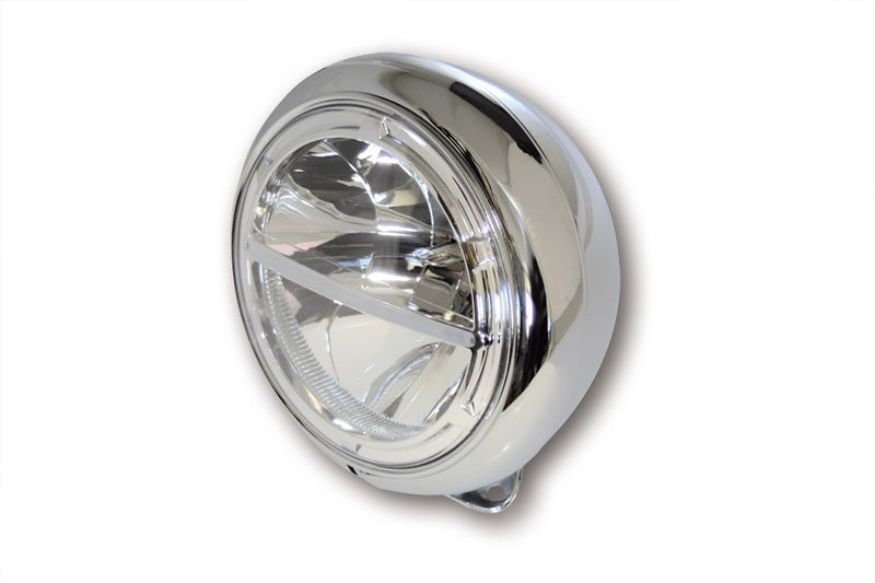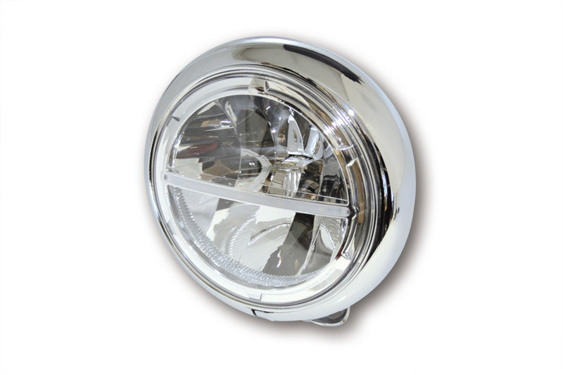 HIGHSIDER 7-inch LED headlight VOYAGE HD-STYLE for bottom mounting Innovative power LED headlight in a purist design with parking light function. The oval metal housing is painted black or chrome-plated, the insert is chrome-plated. The LED technology and the used reflector produce a symmetrical, bright light and provide an optimal perception of bikers by other road users, E-examined.