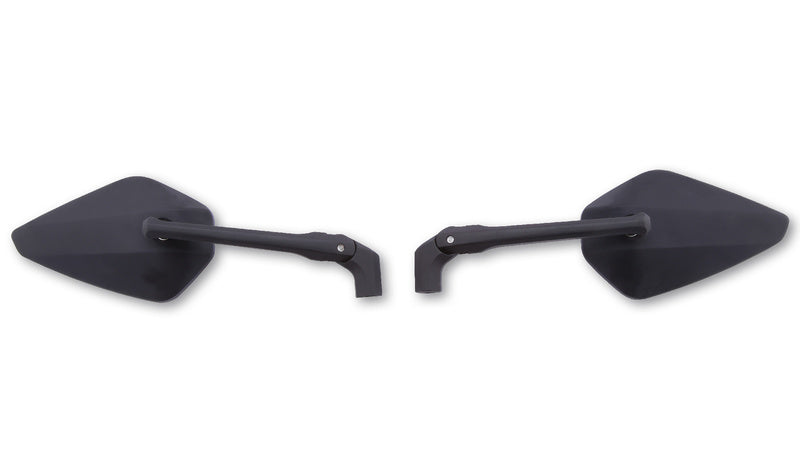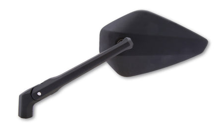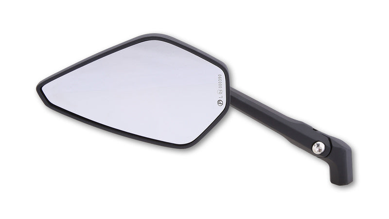 Adjustable mirror arm in matt black anodised aluminium with adjustable handle and convex glass. Thanks to the use of a second joint on the handle, there are additional adjustment possibilities for your safety. Includes extra adapter M10 x 1.25 mm with left-hand thread for Yamaha, E-approved.