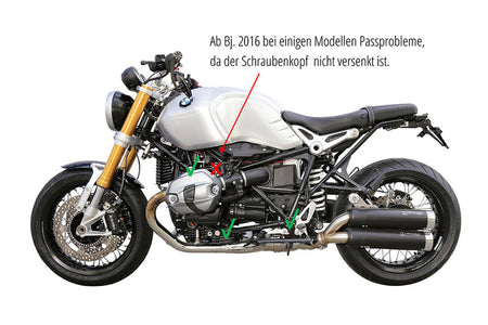 NOTE: Starting with model year 2016, the frame has been changed on some models. This means that the cover cap (vehicle side viewed from the left) does not fit at the top right (above the cylinder head – injection nozzle)! —SEE PHOTO—