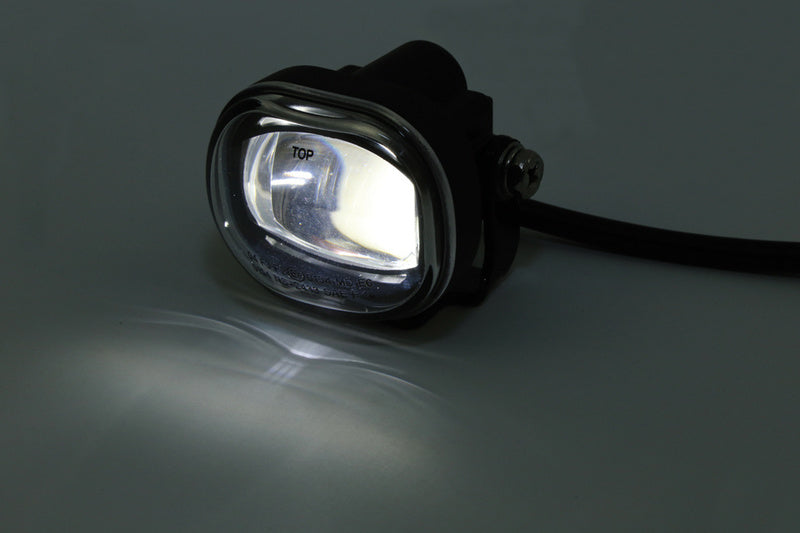 LED fog lamp with black metal housing and clear glass. The universal holder is provided with slotted holes for lower or upper mounting.