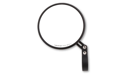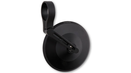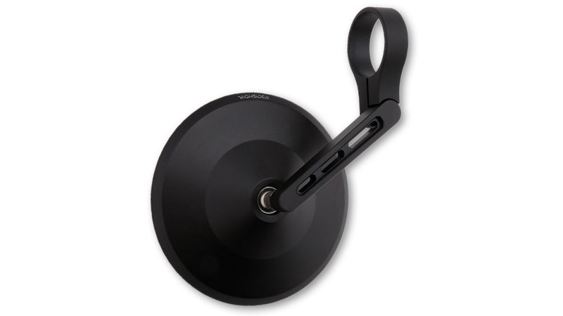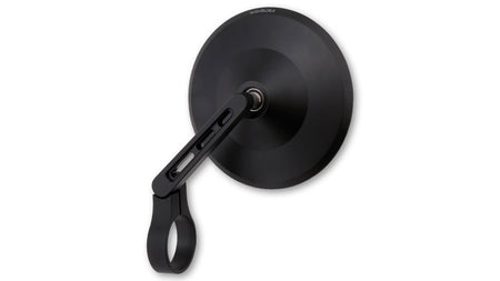 Universal handlebar end mirror, noble design, with a round head made of black anodized aluminum. The mirror arm is equipped with three stylish air slits. A hinge on the clamp provides additional adjustment for better visibility.