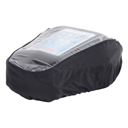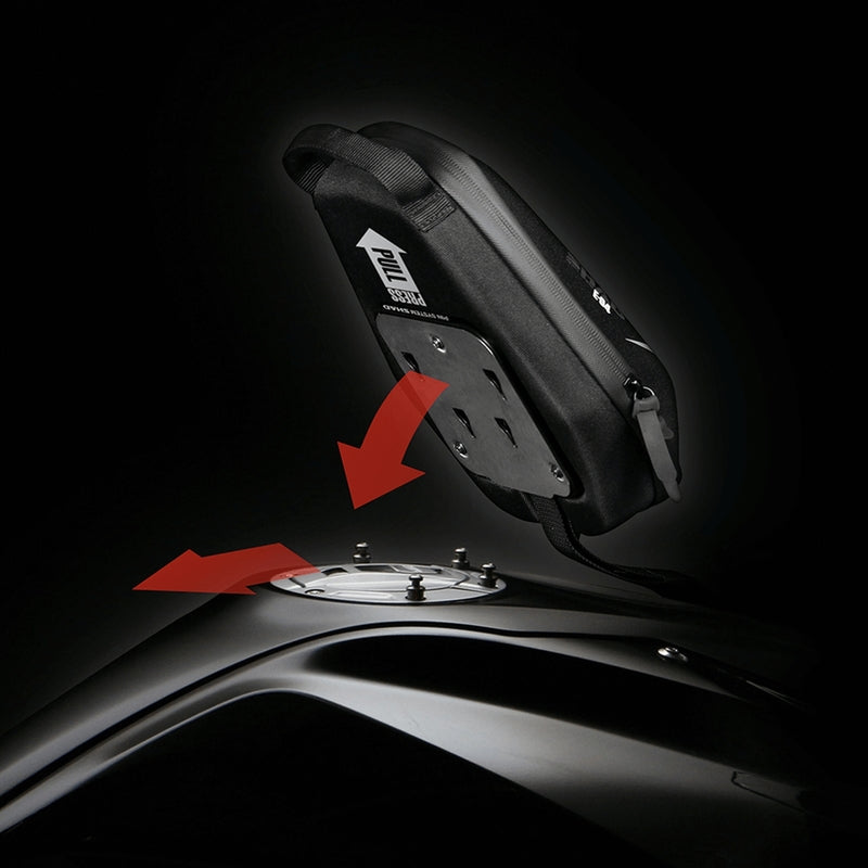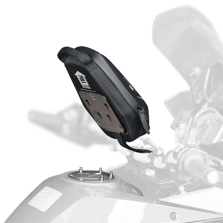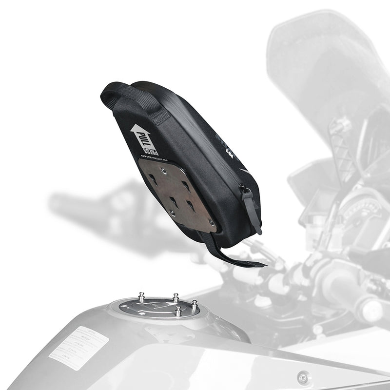 Small semi rigid tank bag with reflective elements to increase security. With a mobile phone compartment with touch screen film. Motorcycle fixation through a universal base tank.