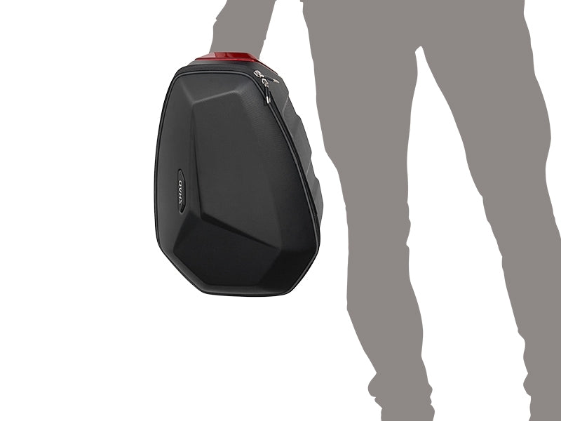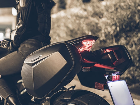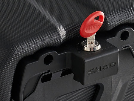Saddlebags with lock system with keys to the SR fitting which allows to lock by combination the main compartment. The fitting system Side Bag Holder SR offers a perfect aesthetics integration to the motorcycle and ensures a strong and light fitting made from polyamide and glass fibre. They have a capacity of 15 litres per bag and can be easily transported thanks to its red accent piece which integrates the carrying handle.