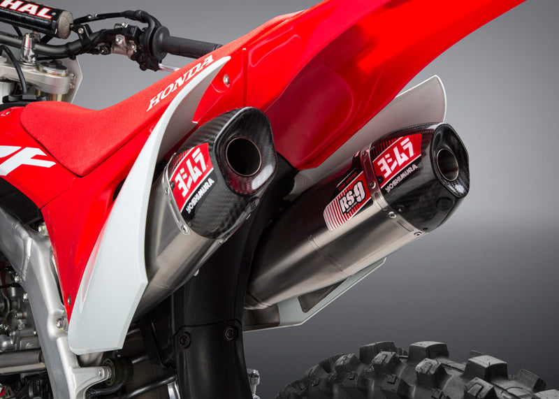 In addition to its aesthetics, the Yoshimura USA RS-9 full system is at the cutting edge of exhaust technology. Equipped with two mufflers, it has been developed exclusively for use on the Honda CR-F.