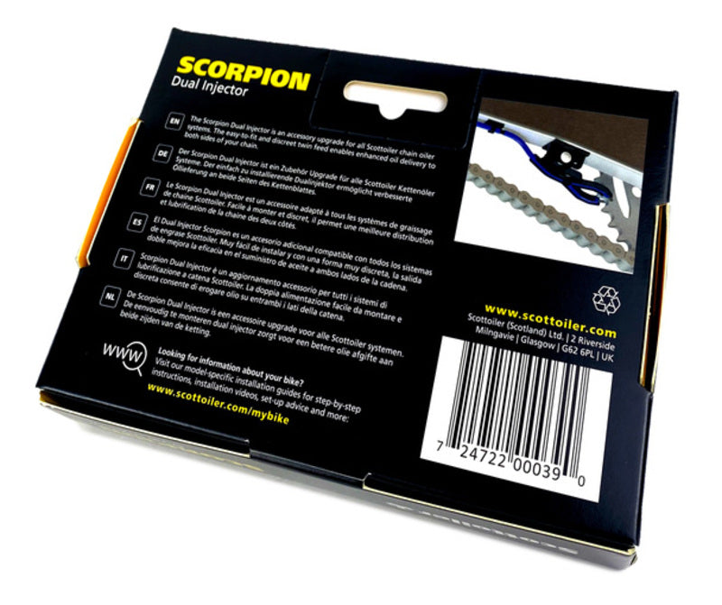 The Dual Injector is an alternative dispenser solution from Scottoiler that feeds oil onto both sides of the chain simultaneously.