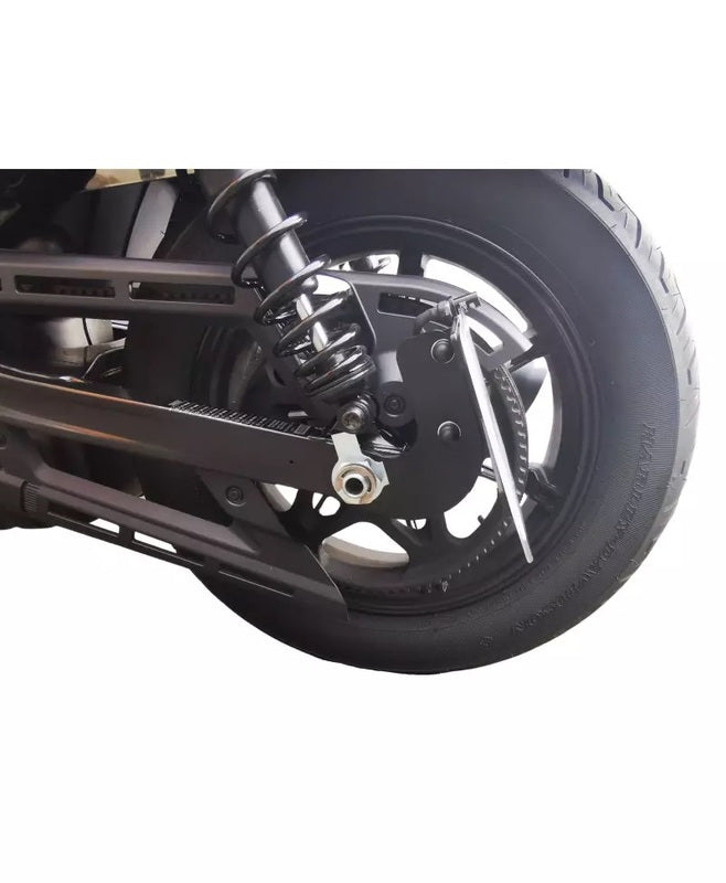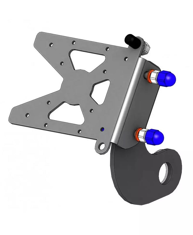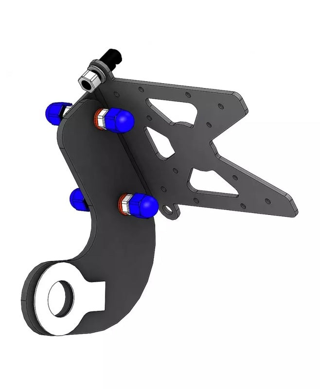 The side plate support is designed in two elements to be able to adjust its inclination. It is placed on the swingarm, we use the wheel axle to fix it.
