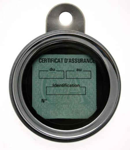 Round insurance label holder with fixing foot.
