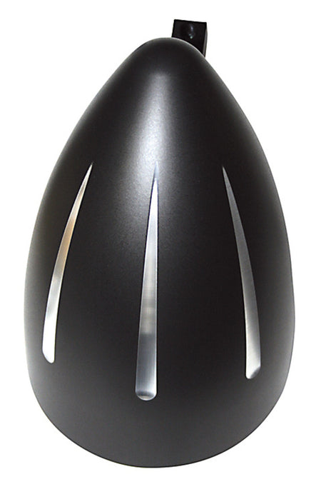 H4 halogen headlight with a high quality black aluminum housing with 3 distinctive CNC milled grooves and a nostalgic umbrella (length: about 25 mm) in retro look. The headlight has an asymmetric prismatic reflector – only approved for right-hand traffic – and parking light, E-approved.