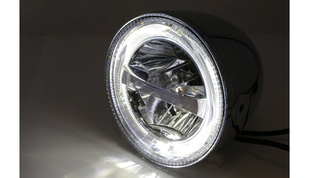 HIGHSIDER 5 3/4 inch LED headlight CIRCLE with DRL / PL, metal housing, side mounting, E-marked. Available in different colours.