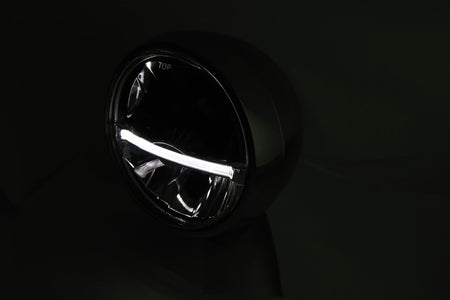 The classic for all Cruiser models -round LED headlight with chrome or black metal body and chrome insert and clear glass for bottom mounting. The LED parking light is shown in the middle of the insert as a light strip (Light Guide System). The headlight has an asymmetric prismatic reflector, E-approved.
