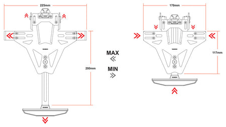 The AKRON-RS turn signal holders are adjustable in width and are therefore suitable for all types of turn signals. This adjustment option allows you to adapt the position of your turn signals to the most diverse license plates. The 10 mm holes are on the side to allow the indicators to be mounted without disconnecting them from the wiring harness.