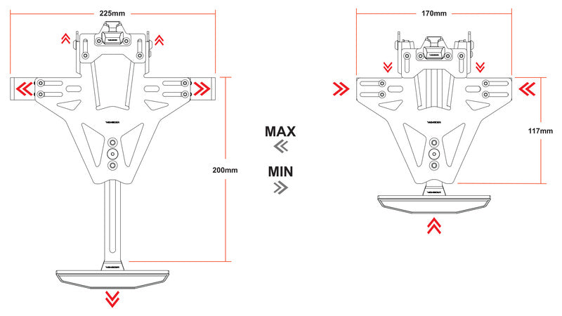 The AKRON-RS turn signal holders are adjustable in width and are therefore suitable for all types of turn signals. This adjustment option allows you to adapt the position of your turn signals to the most diverse license plates. The 10 mm holes are on the side to allow the indicators to be mounted without disconnecting them from the wiring harness.