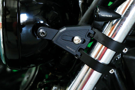 The perfect set for your conversion project. Precisely processed lamp holders of the extra class, elaborately CNC-milled and anodized. The black aluminium lamp holder set contains 4 fork tube clamps as well as 2 holders and 2 reducing strips each. Several adjustment options simplify the alignment of the headlight on your chopper, cruiser or naked bike. The EXTEND lamp holders are adjustable in length, so that the distance for the spotlight can be variably adjusted from approx. 35 mm to 90 mm. Attached to the fork, the headlight can be mounted close to the bike. The brackets are attached to the clamps in such a way that they can be adjusted to the width of the headlamp. The diameter can be reduced with the enclosed insert strips.