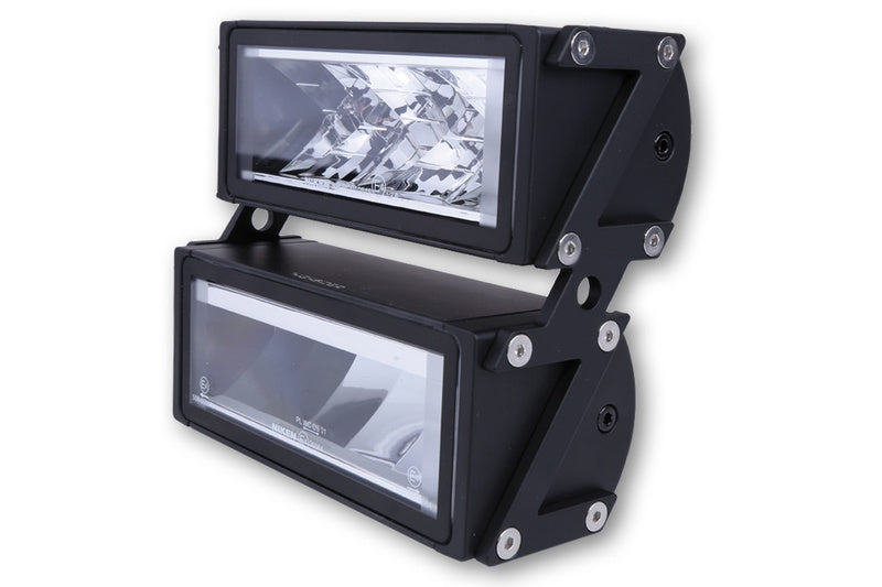 Combined with a holder in Z-shape, this LED headlight set consists of a high beam and low beam headlight with position light. There are cooling fins on the back of the aluminium housing.