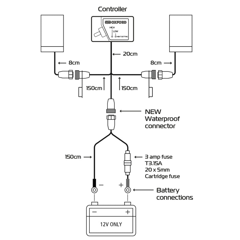 Weatherproof heated overgrips with two heat settings and featuring a new easy use controller unit with waterproof connectors.